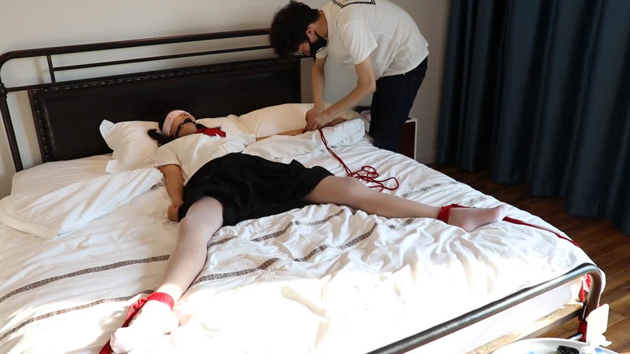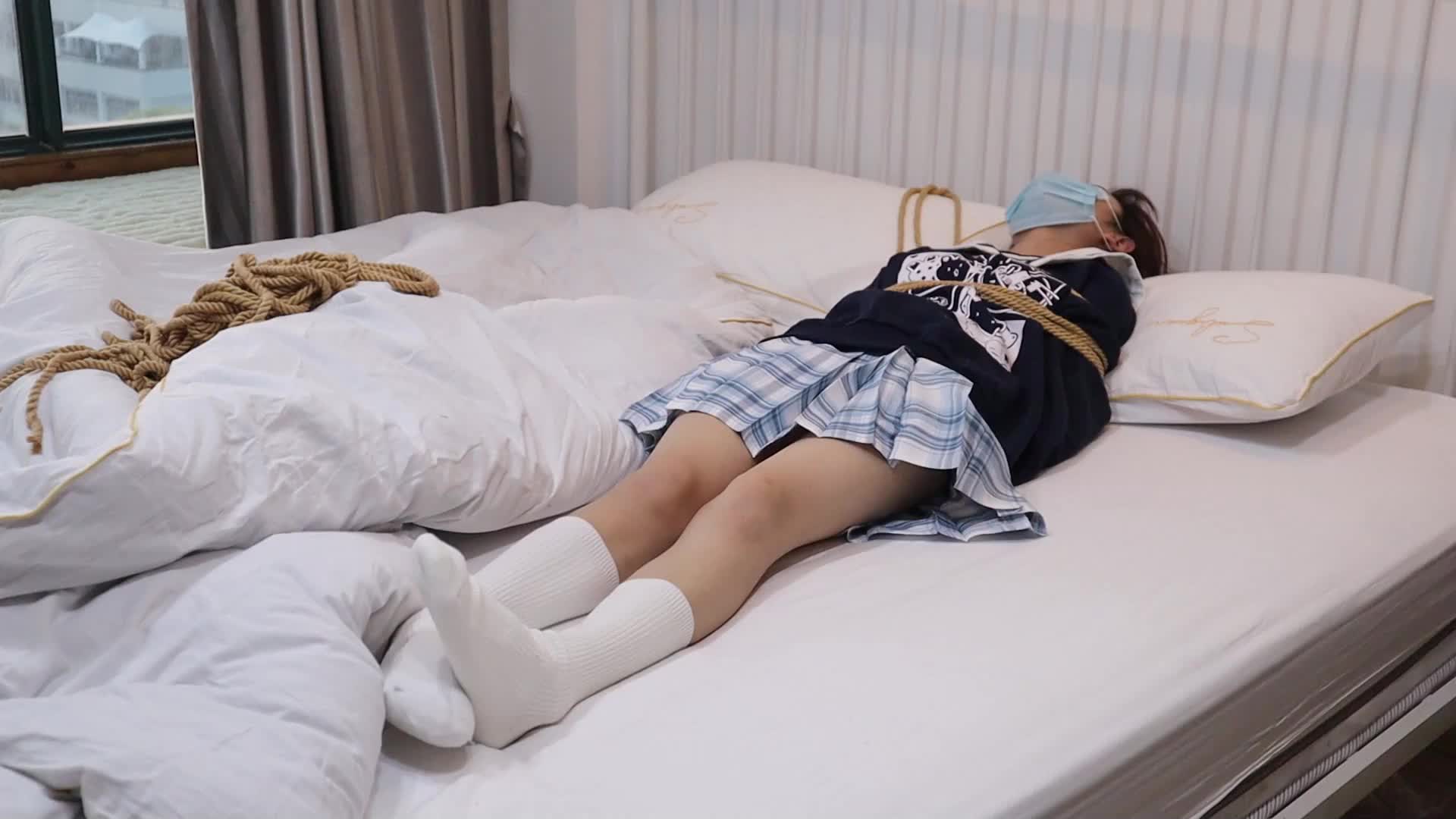 ●服装 水手服+白丝+白色花边短袜+黑色小皮鞋。 双马尾 ●剧情 茶茶出游回家后没有关好门,坐到床上后感觉有点困,衣服都没换便躺下睡觉了。 这时坏人悄悄溜进来准备窃取钱财,看床上躺着一个人,便以防后患将茶茶绑了起来(绑法:日式小高手,并拢绑住脚腕)。 过了一会儿,茶茶醒来发现自己被绑着,急忙挣扎了一会儿,然后慢慢地下床,一蹦一跳地逃出房间,朝着大门跳去。就在茶茶准备开门的瞬间,坏人回来了,坏人见状,不管茶茶被绑住的双脚,便将茶茶拽回了房间里,然后加固了茶茶的拘束(在原来的基础上绑住小腿,然后从背后引出绳子绑成驷马)。坏人询问茶茶银行卡密码,茶茶慌乱中随便说了个密码,坏人见密码到手,立刻用口球堵住了茶茶的嘴,然后出门取钱了。 茶茶原地挣扎一会儿,发现无法挣脱,便趁着坏人不在的时间挪动到房间外,然后继续向大门处挣扎。由于在挣扎过程中消耗太长时间,坏人回来后再次看到逃跑中的茶茶,加上茶茶告诉他的密码是错的,便狠下心要收拾一下茶茶。 坏人将茶茶拎回房间床上,脱掉茶茶的鞋子和花边袜,将袜子塞进茶茶的嘴里,鞋子放在茶茶面前,压住茶茶狠狠挠茶茶的白丝小脚丫。 最后,坏人将茶茶丢在床上,扬长而去,留茶茶一个人绝望地挣扎。 茶茶在绝望中陷入黑暗,只能在不可能挣脱的束缚中无谓的挣扎,等待别人的发现... 作品完成度超级高,在剧本上存在情节延伸~新增逃脱失败剧情等~ 茶茶挣扎超级可爱~