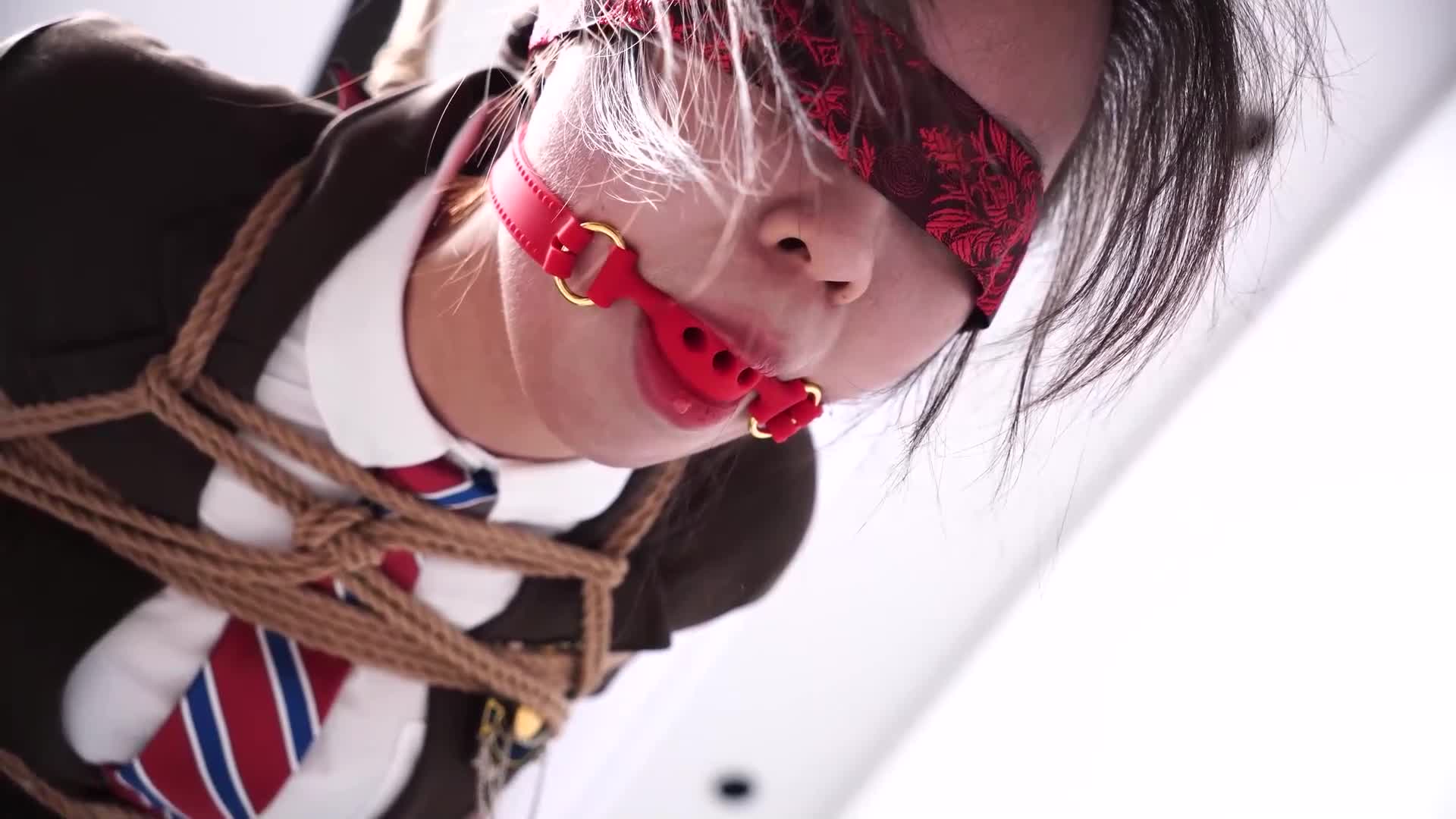Beautiful Rongrong in a plaid skirt. Arms twisted behind her back, handcuffs and shackles on her ankles, blindfolded and gagged, escorted and kneeling bound.