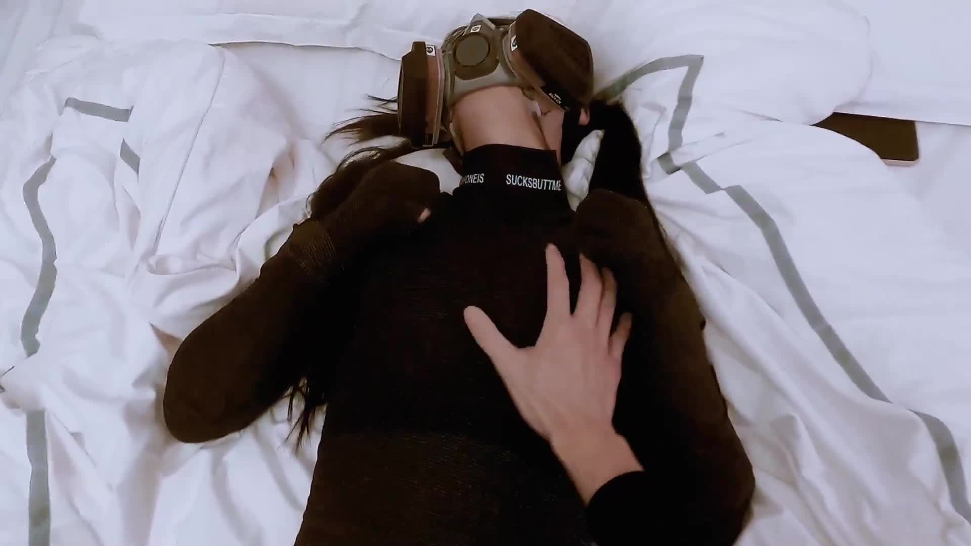 Breath Play with Gas Mask, Fixed Vibrator, and Inflatable Butt Plug Torturing Latex Slave