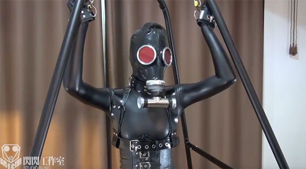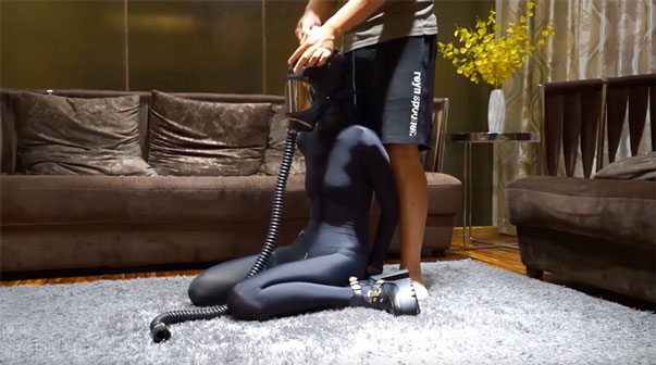 A latex-clad slave is subjected to breath play with a vacuum bottle attached to a gas mask, a fixed vibrator, and an inflatable butt plug for torture.