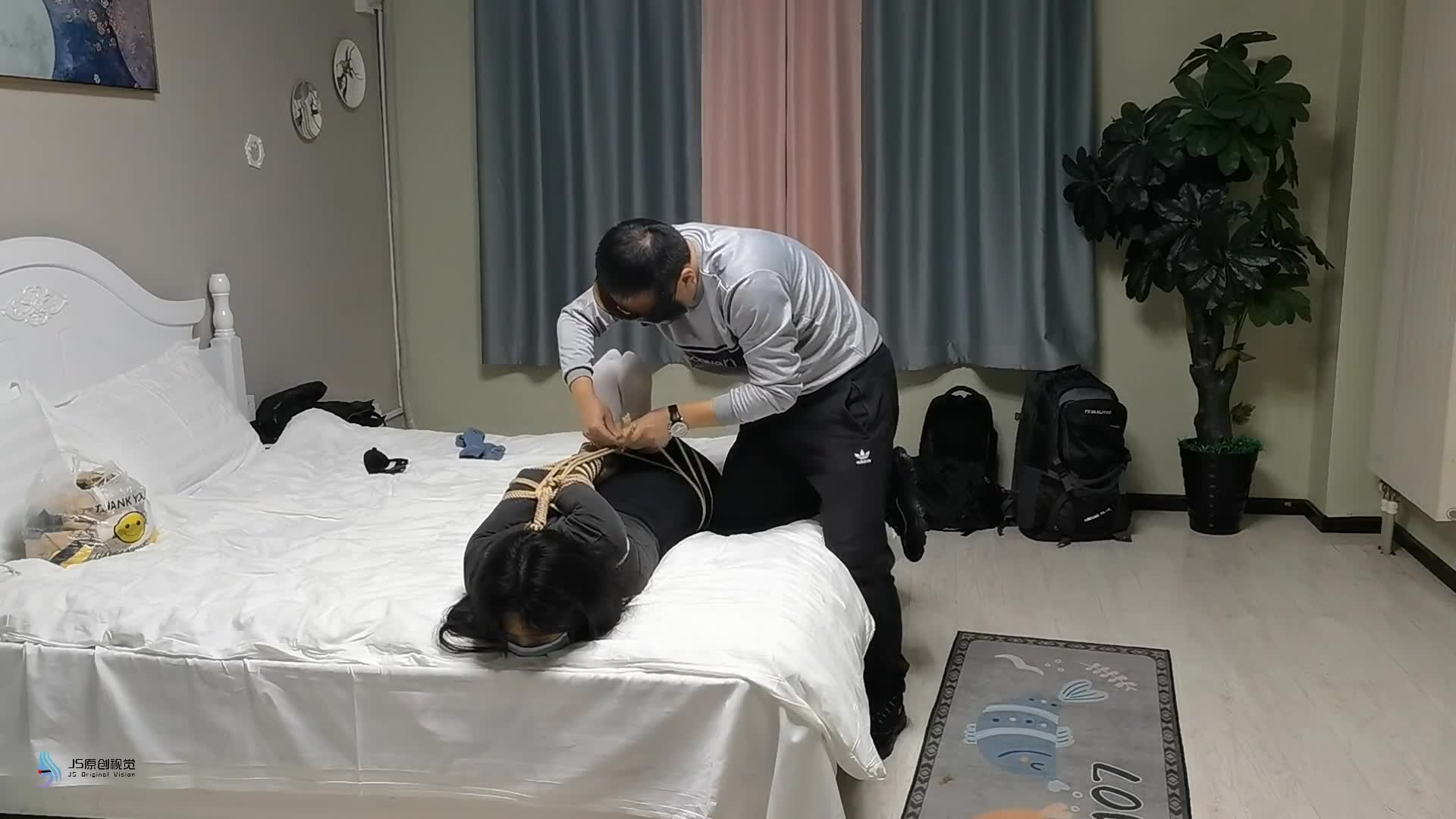 A custom shoot of stocking gag, hooding, and bondage training. 1. Liang Jiang starts wearing two pairs of stockings, playing with them at home, then slowly removes one, covers her eyes, ties a knot in front, removes the mask, puts a short stocking on her tongue, and stuffs the knot into her mouth. Then she uses another stocking to cover her mouth and nose, tying it at the back. 2. Bei Bei enters, sees Liang Jiang playing with the stockings, and since Liang Jiang can't see, she sneaks up, pins her to the bed, ties her hands with a stocking, uses a short stocking to prevent escape, then binds her with rope, unties the stocking from her mouth, removes her stockings, stuffs them in her mouth, covers her mouth with a stocking, puts a stocking over her head, and ties it with the stocking legs. 3. She binds her legs in a folded leg tie, secures a vibrator, and Liang Jiang wriggles and struggles before the end.