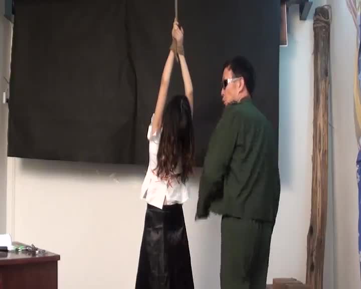 Domestic real torture interrogation, suspension bondage and whipping, the wooden block under her feet was kicked away, she can only barely stand on her tiptoes.