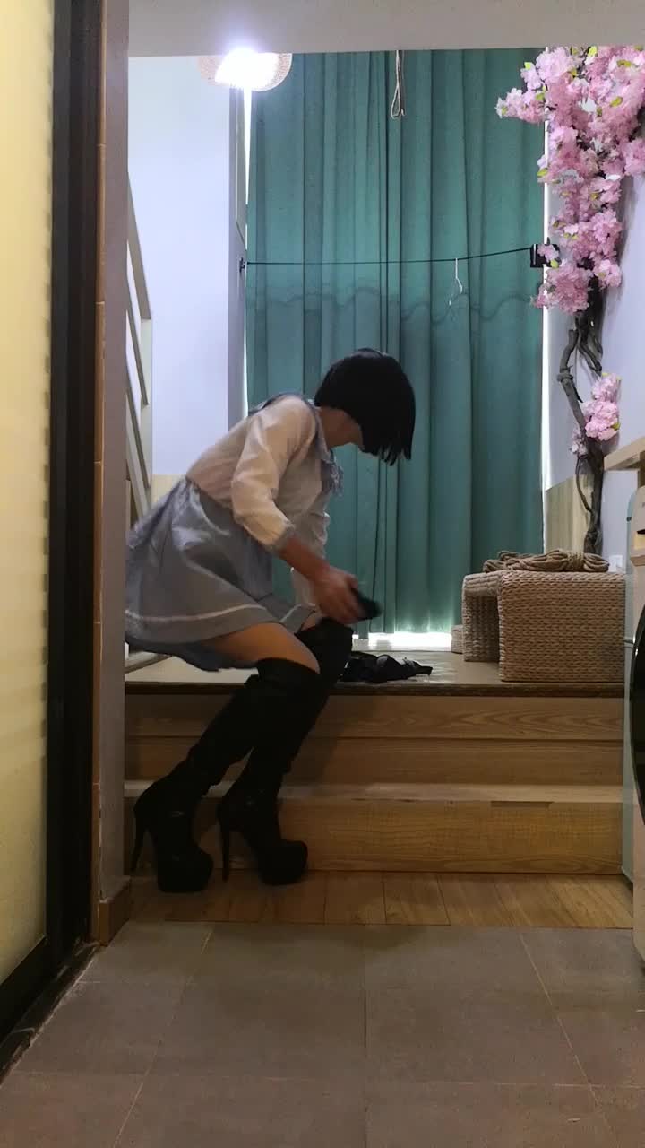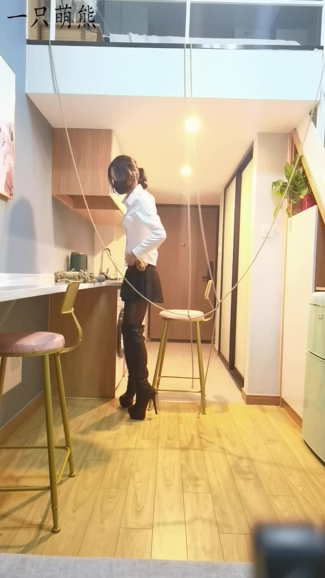 This is a cute scene of self-binding in a straight arm forced leg spread high heels standing punishment! 💖