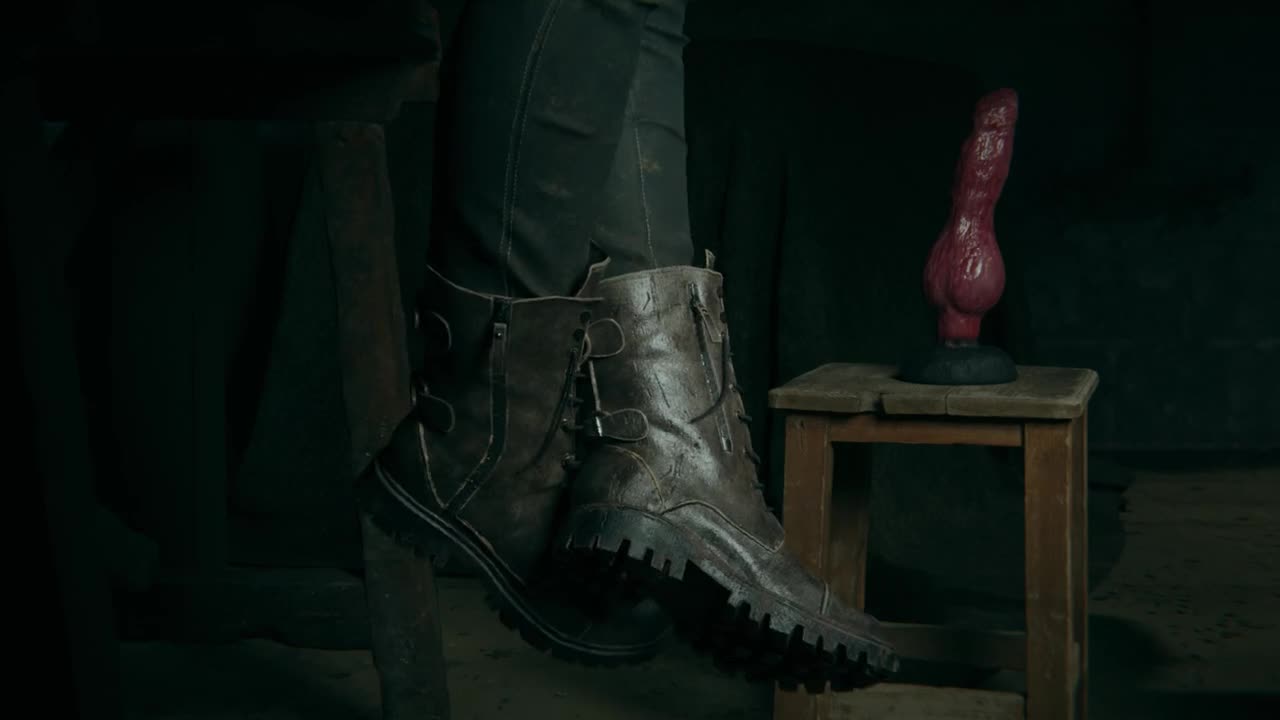 A scene where a woman in red lingerie is bound with ropes in a room with various items scattered around.