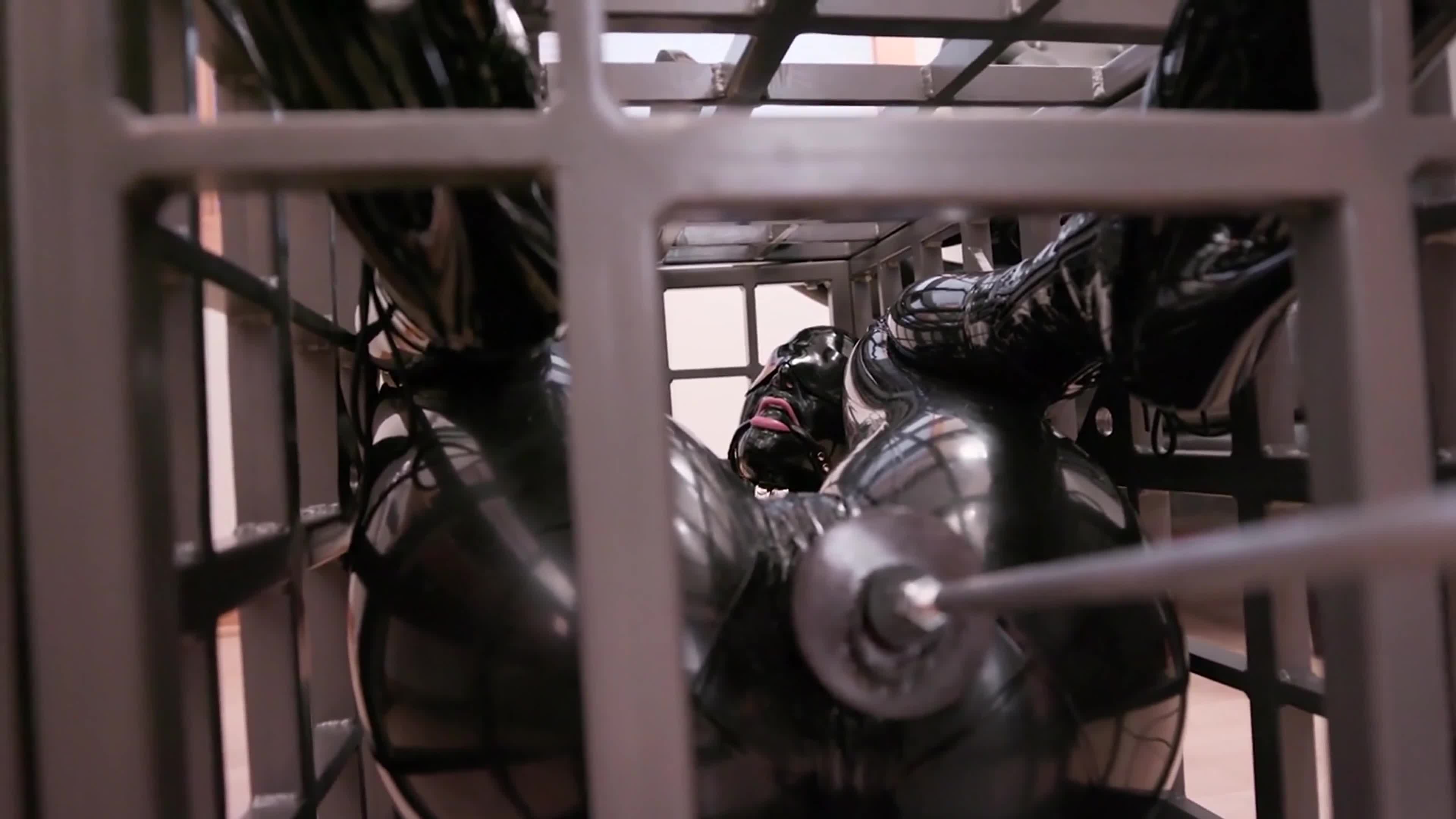 Breath play hood, vibrator, latex, restraint fixation