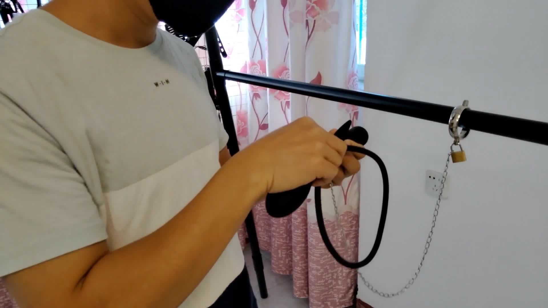 After an enema, an inflatable butt plug is inserted.