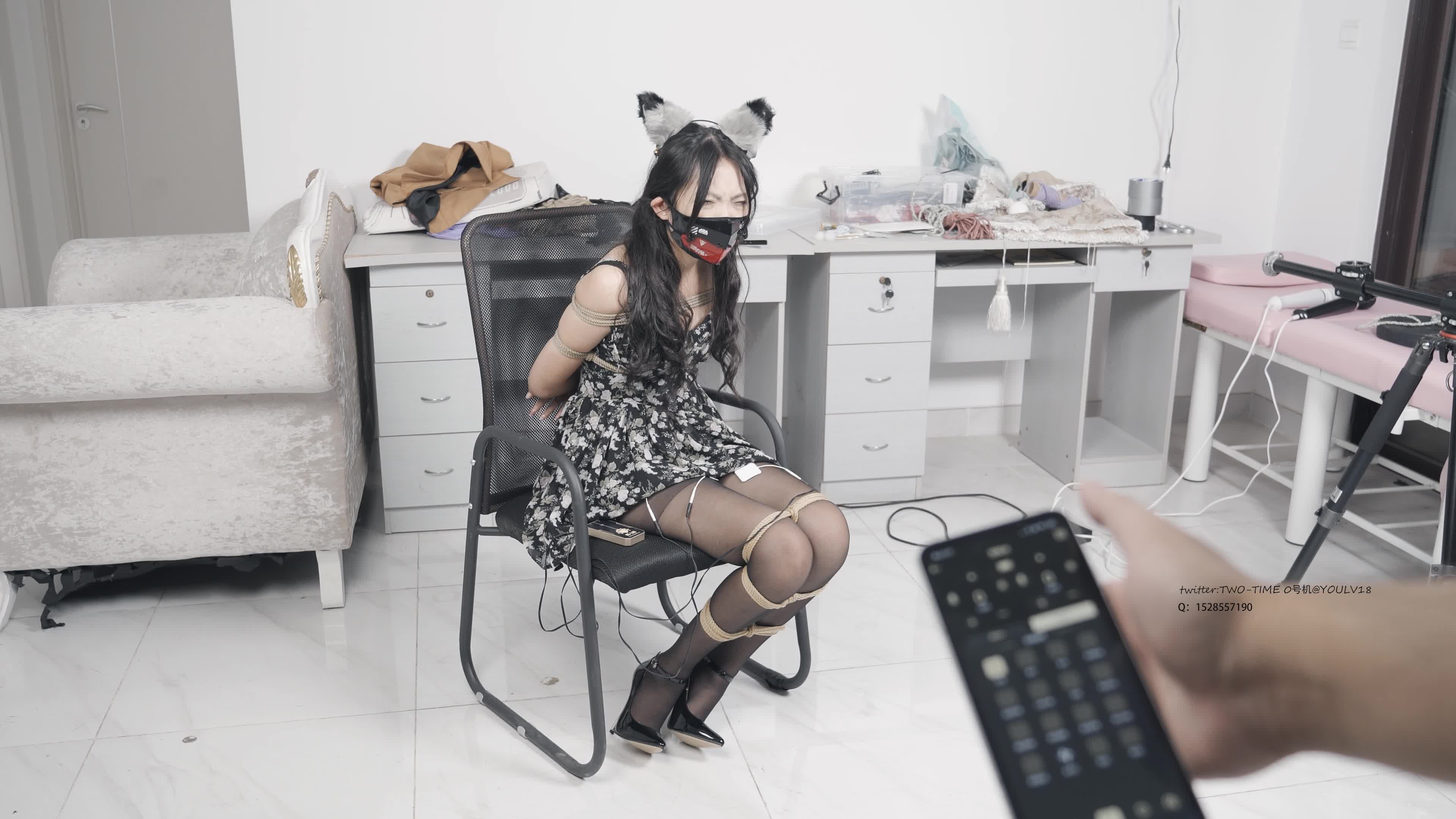 A girl in a floral dress with animal ears, wearing high heels, is tied up with ropes in an office setting. She is subjected to electrostimulation and is connected to a strong vibrator and a medium-sized bubble machine.