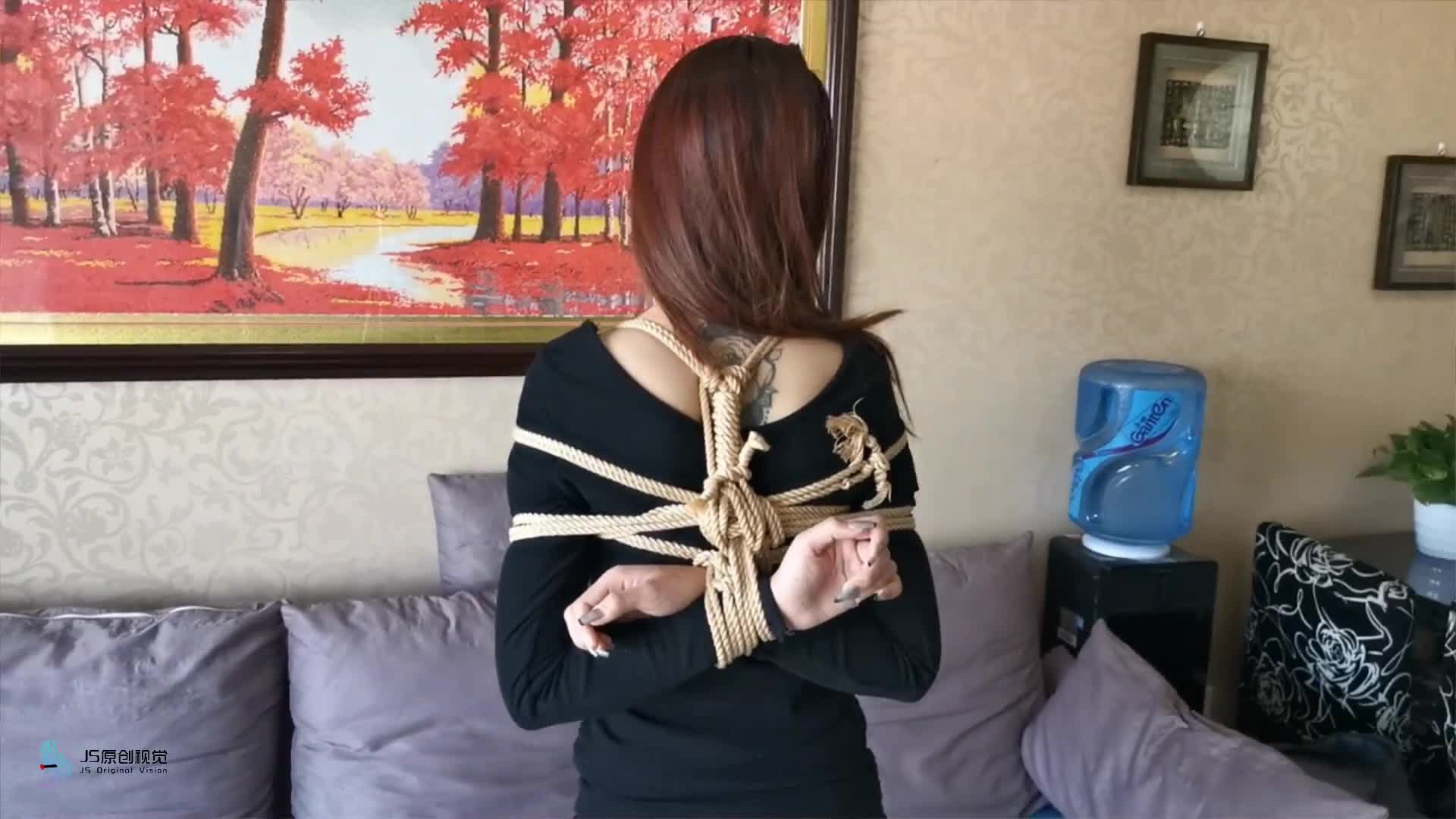 JS Original: Jin Xuan in a sexy one-piece dress with fishnet stockings, hogtied, with electrostimulation.