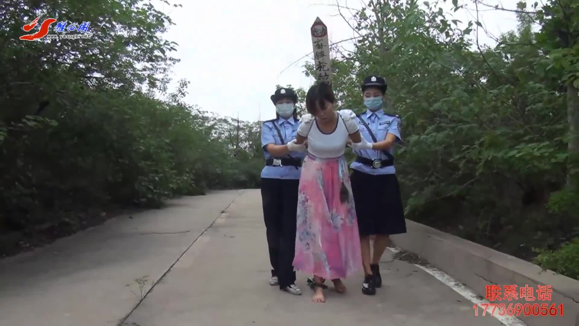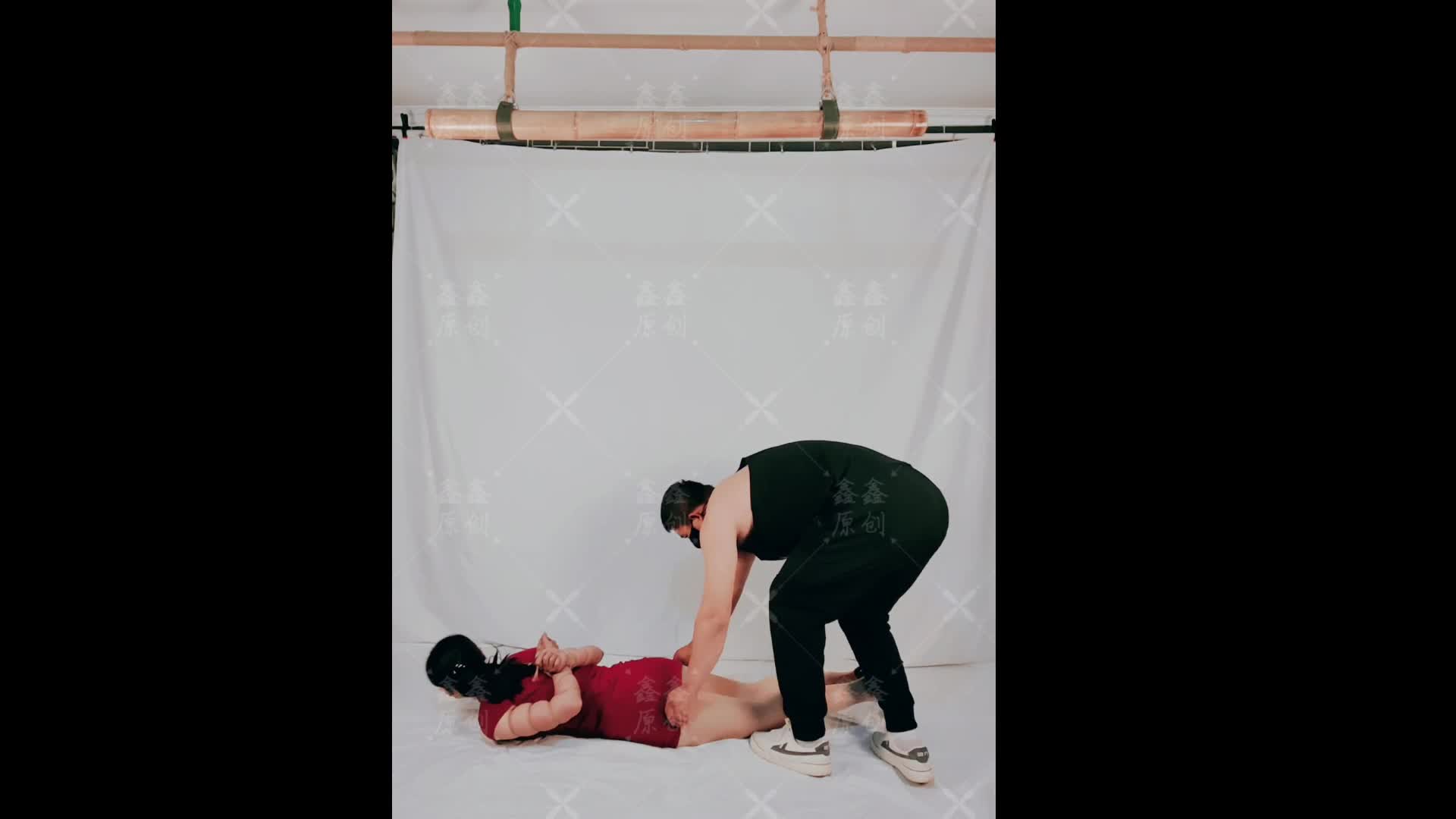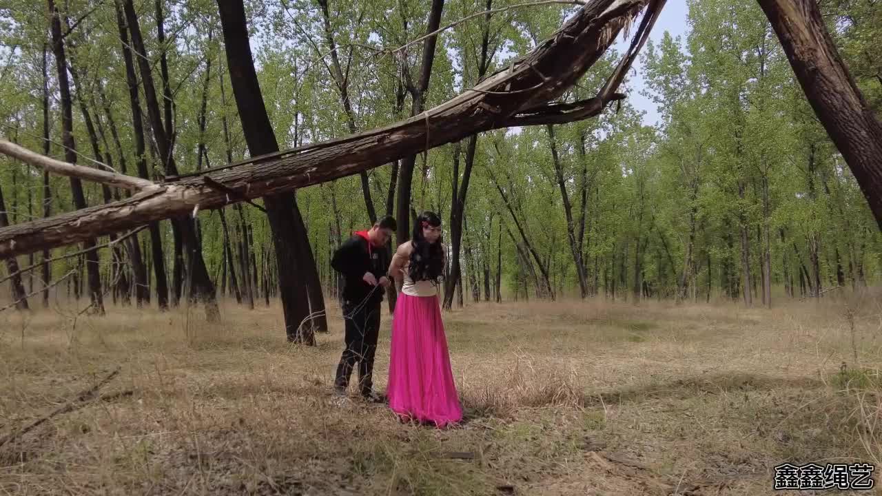 Wenwen tied in a hogtie with red rope and being interrogated