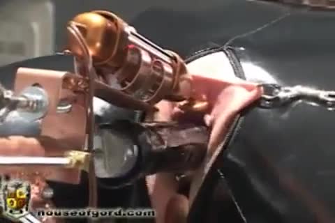 A woman in black stockings is bound and placed on a machine with a vibrator inserted.
