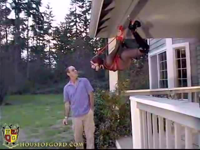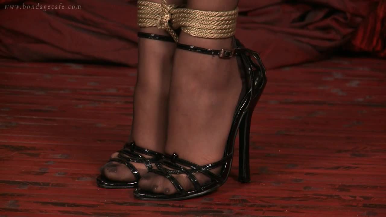 Inverted suspension has its tricks, and the butt has its uses. At Peninsula Bondage Platform, Quinn demonstrates that while it seems like the feet are suspended, the actual support comes from the butt or waist. If you really put the stress on the girl's ankles, she would definitely fall on you when she comes down.