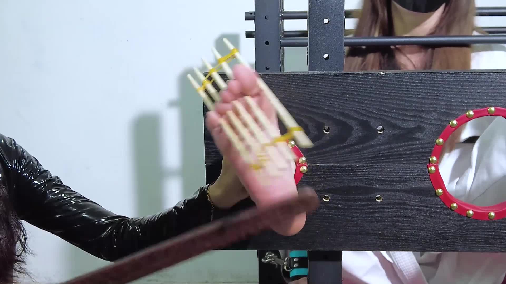 European-style straight-arm forced open mouth drooling, intense spanking, crab tie fixed loop strong climax, extreme cane torture on abdomen and vulva until pain causes fainting and spasms, spider web style fixed on bed