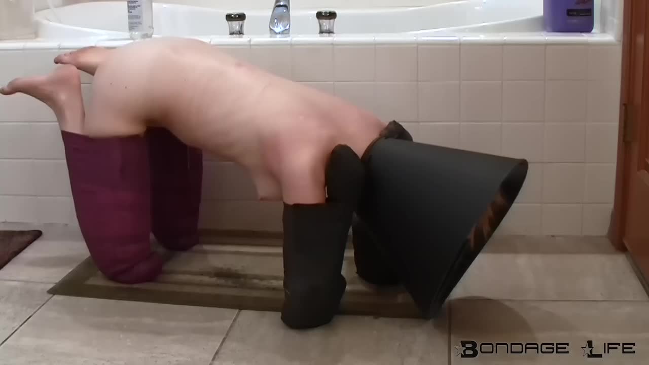 A vibrator is fixed in place, with nipple clamps and bucket torture, causing the toes to move continuously from the torment.