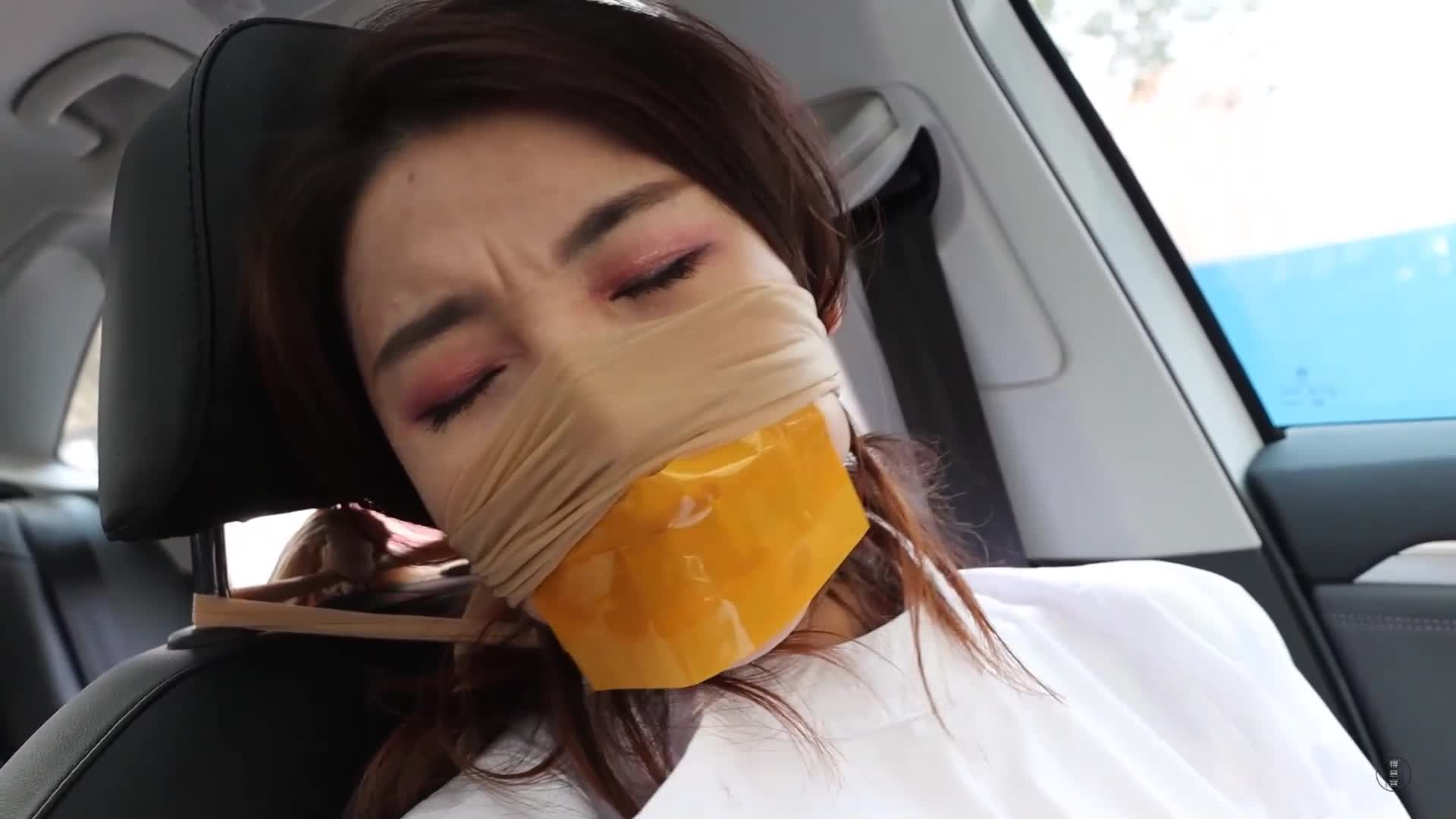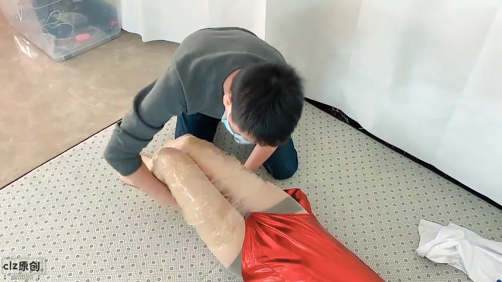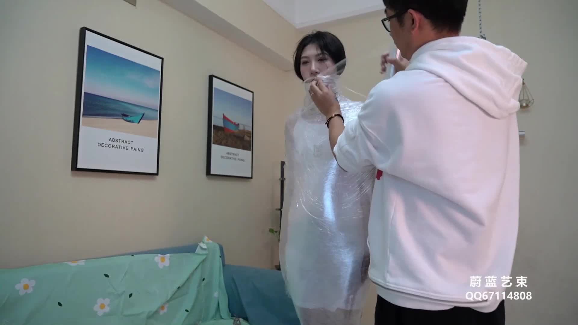 Yishe and Zi Han are wrapped in plastic wrap and black tape like mummies. They are also wearing a mouth opener, inflatable gag, and stockings in their mouths.