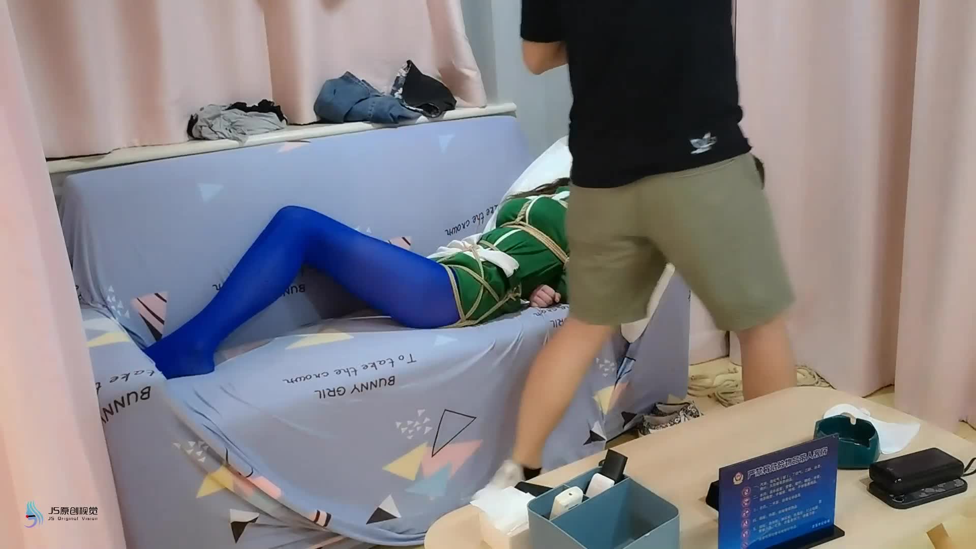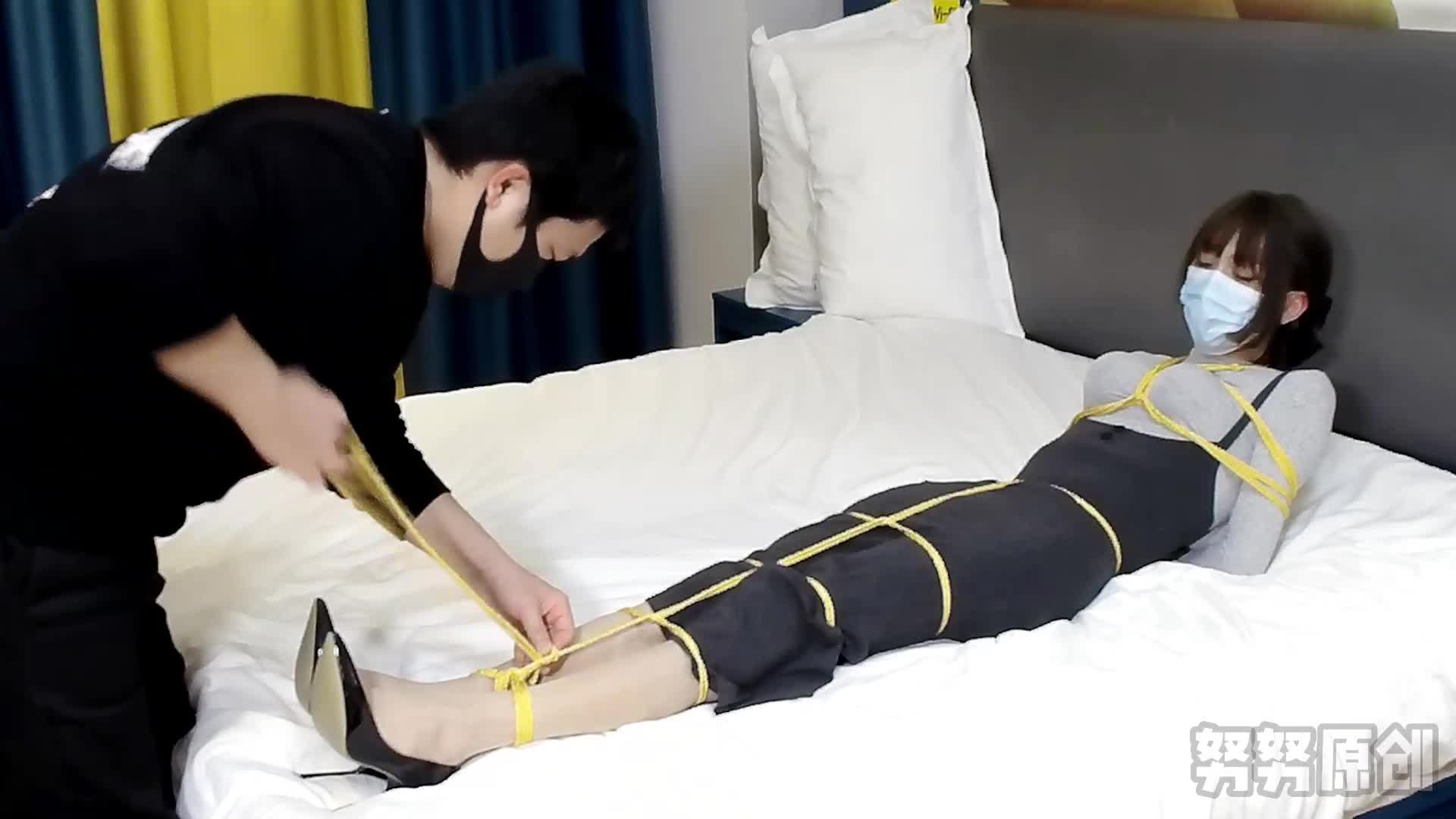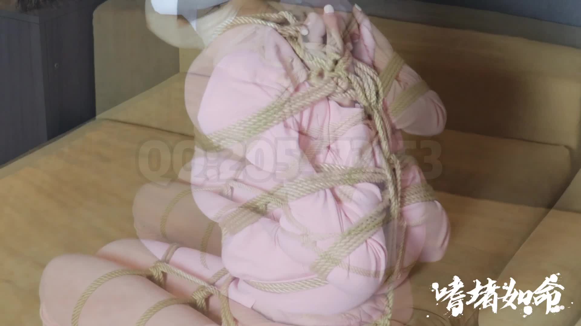 A custom shoot of stocking gag, hooding, and bondage training. 1. Liang Jiang starts wearing two pairs of stockings, playing with them at home, then slowly removes one, covers her eyes, ties a knot in front, removes the mask, puts a short stocking on her tongue, and stuffs the knot into her mouth. Then she uses another stocking to cover her mouth and nose, tying it at the back. 2. Bei Bei enters, sees Liang Jiang playing with the stockings, and since Liang Jiang can't see, she sneaks up, pins her to the bed, ties her hands with a stocking, uses a short stocking to prevent escape, then binds her with rope, unties the stocking from her mouth, removes her stockings, stuffs them in her mouth, covers her mouth with a stocking, puts a stocking over her head, and ties it with the stocking legs. 3. She binds her legs in a folded leg tie, secures a vibrator, and Liang Jiang wriggles and struggles before the end.