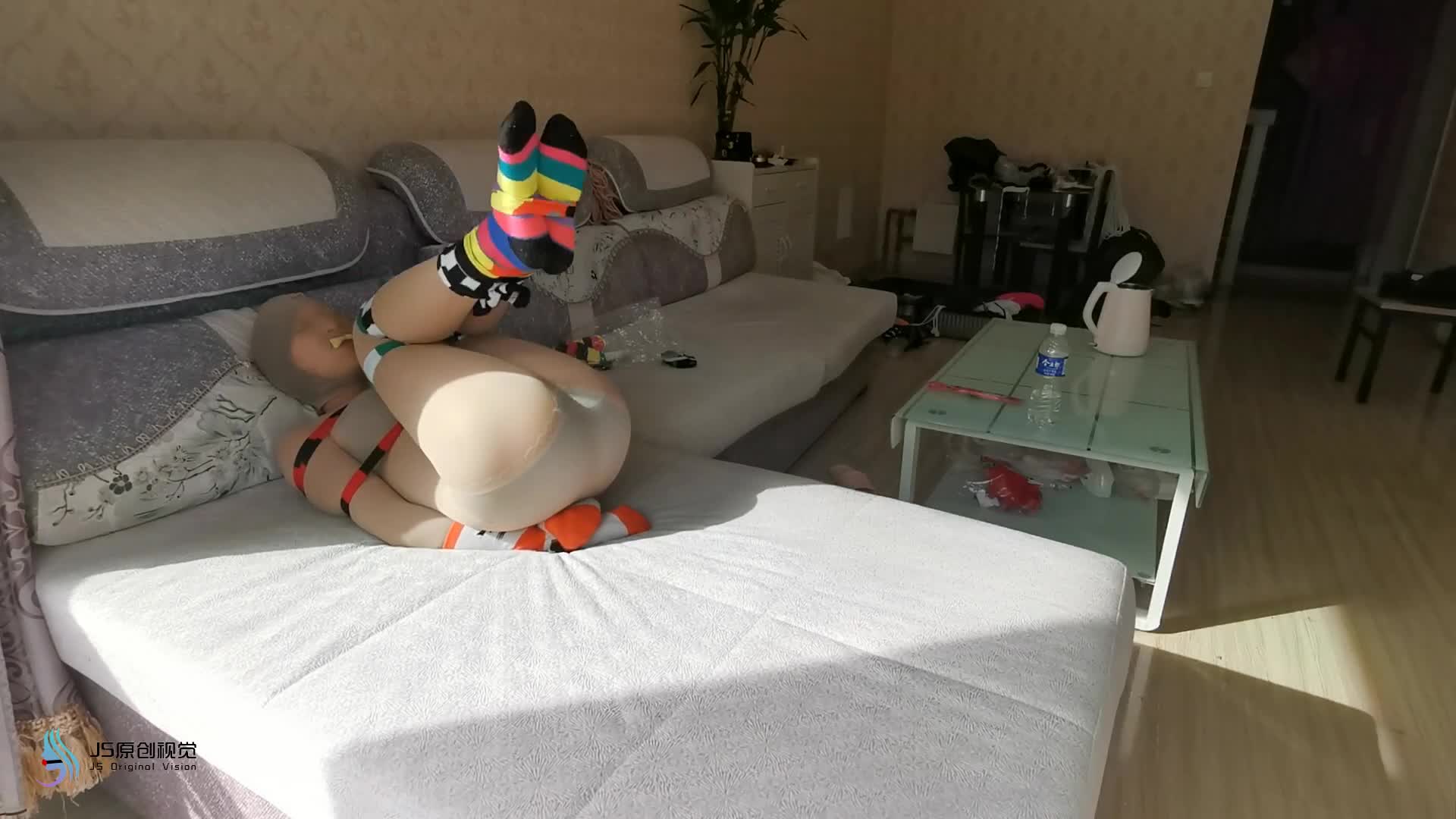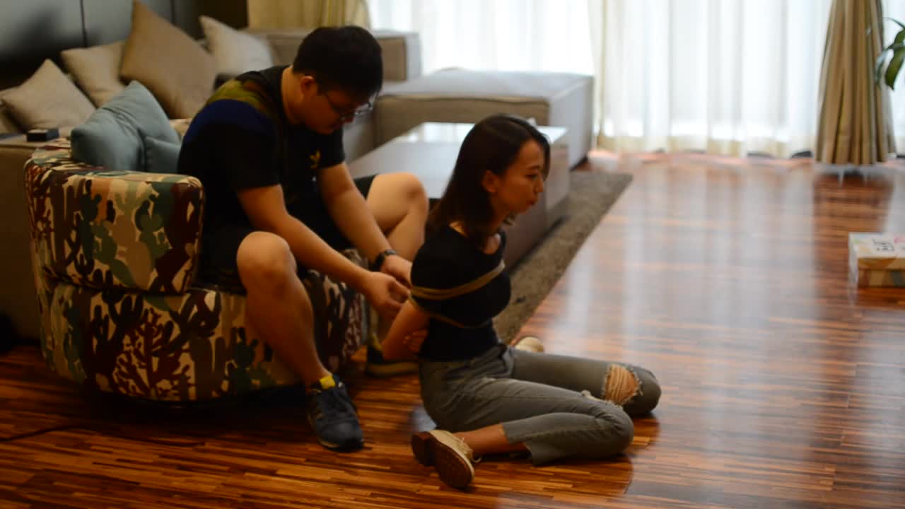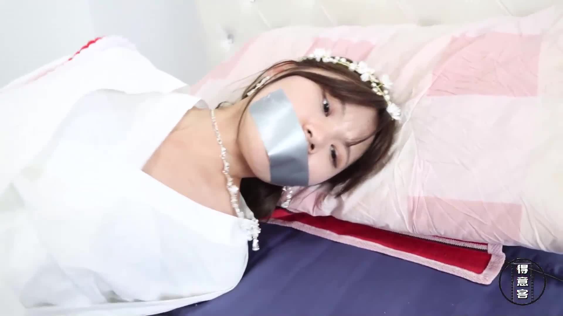 A custom shoot of stocking gag, hooding, and bondage training. 1. Liang Jiang starts wearing two pairs of stockings, playing with them at home, then slowly removes one, covers her eyes, ties a knot in front, removes the mask, puts a short stocking on her tongue, and stuffs the knot into her mouth. Then she uses another stocking to cover her mouth and nose, tying it at the back. 2. Bei Bei enters, sees Liang Jiang playing with the stockings, and since Liang Jiang can't see, she sneaks up, pins her to the bed, ties her hands with a stocking, uses a short stocking to prevent escape, then binds her with rope, unties the stocking from her mouth, removes her stockings, stuffs them in her mouth, covers her mouth with a stocking, puts a stocking over her head, and ties it with the stocking legs. 3. She binds her legs in a folded leg tie, secures a vibrator, and Liang Jiang wriggles and struggles before the end.