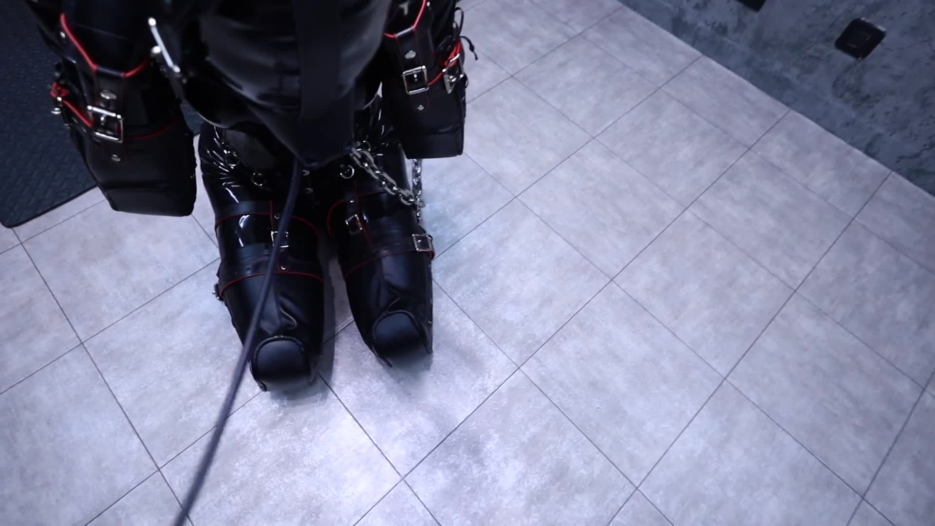 Baby bondage irrumatio. The scene shows a person in a restrictive position on a wooden floor, wearing a black outfit with white frills. The person is bound with leather straps and chains, and there's a wand massager being used.