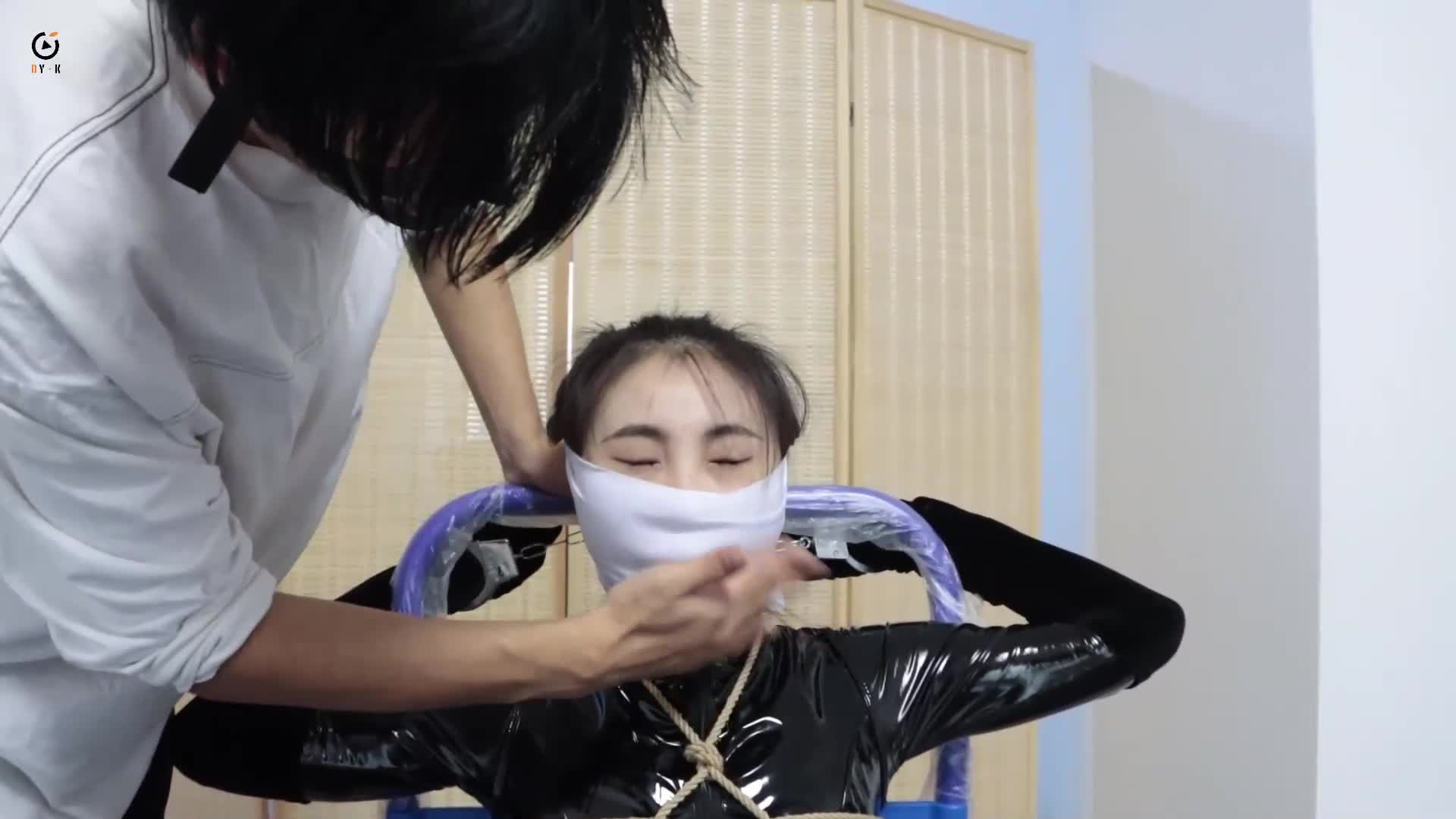 In this scene, Zihan is in a JK uniform, undergoing advanced suspension bondage with a gag, inflatable gag, and pantyhose in her mouth.