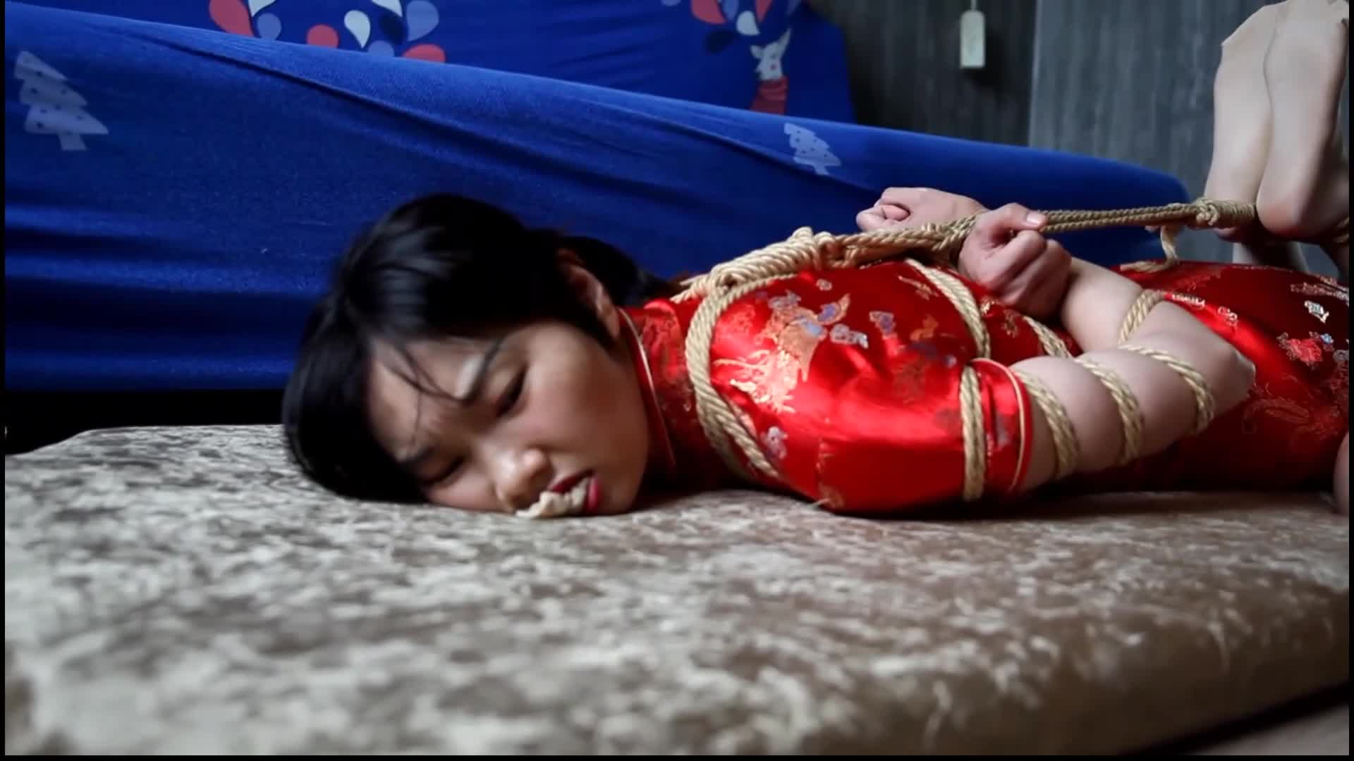 A girl wearing a 'red traditional outfit' experiences hogtie, suspension, silk stockings gag, and foot tickling.
