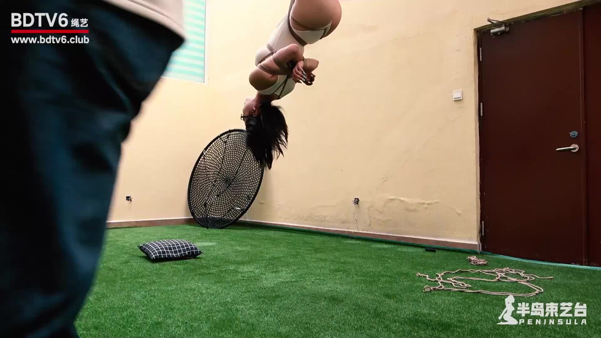 Inverted suspension has its tricks, and the butt has its uses. At Peninsula Bondage Platform, Quinn demonstrates that while it seems like the feet are suspended, the actual support comes from the butt or waist. If you really put the stress on the girl's ankles, she would definitely fall on you when she comes down.