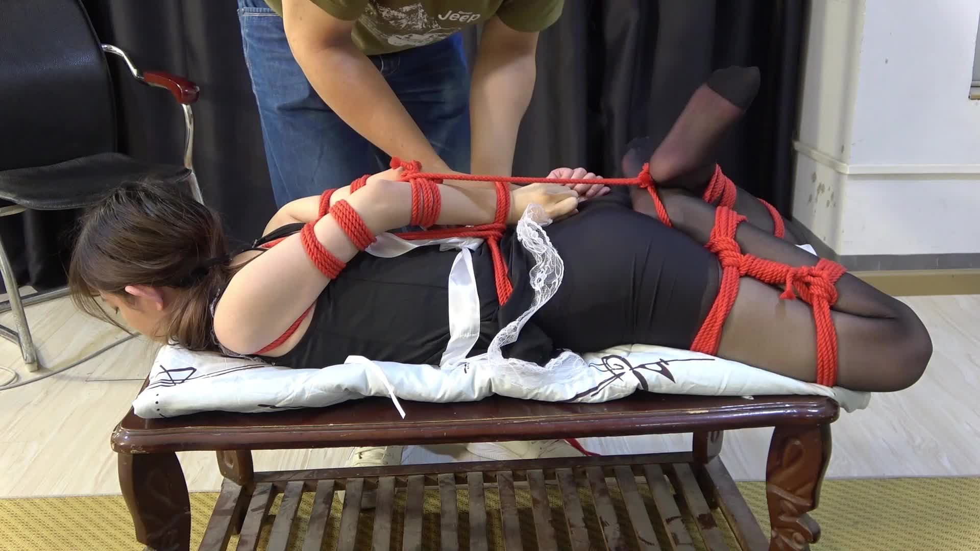 Custom shoot of Shanshan in maid outfit with black stockings, tightly bound with straight arm tie